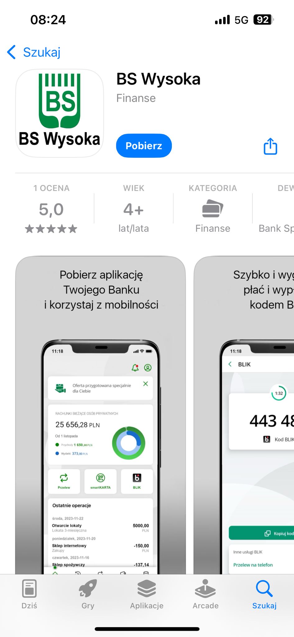 | Android (Google Play): aplikacja widnieje jako „Nasz Bank”. | iOS (Apple App Store): aplikacja widnieje pod nazwą „BS Wysoka”. |